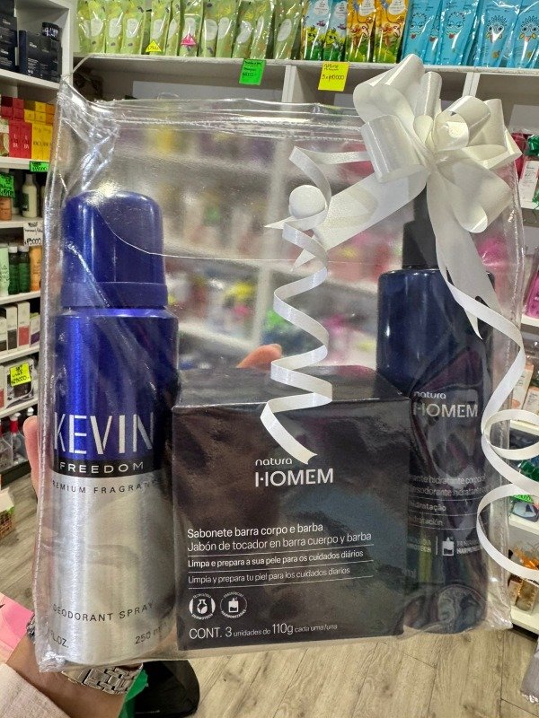 Este kit contiene desodorante en aerosol Kevin, jabones Homem x3 de 100g, crema corporal Homem 300ml y sobre de cristal con broche de cierre