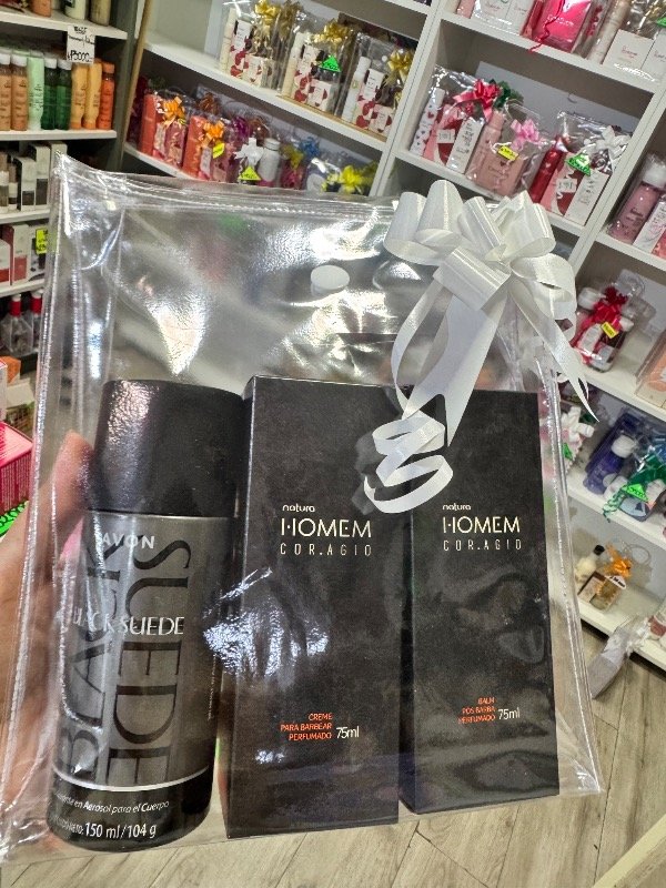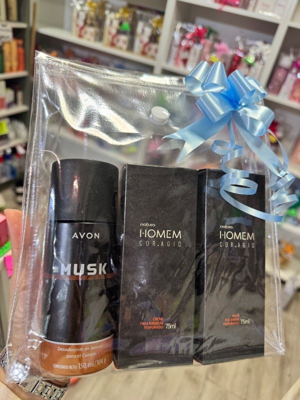 Este kit contiene desodorante en aerosol, crema de barbear y pos barba de la línea Homem, en bolsita de cristal con broche de cierre.